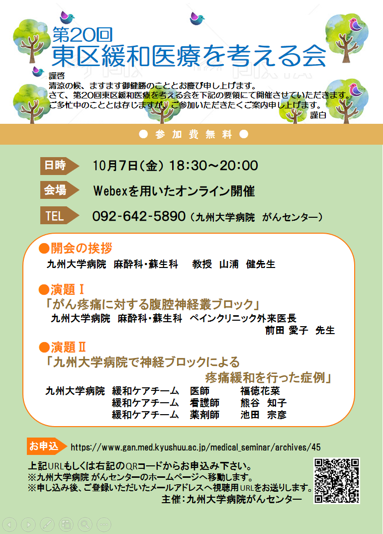 | 演 題 | 1.「がん疼痛に対する腹腔神経叢ブロック」 九州大学病院 麻酔科蘇生科 ペインクリニック外来医長 前田 愛子 先生 2.「当院で神経ブロックにより疼痛緩和を行った症例」 九州大学病院 がんセンター 緩和ケアチーム 医師 福徳 花菜 先生、 看護師 熊谷 知子先生、薬剤師 池田 宗彦先生 |