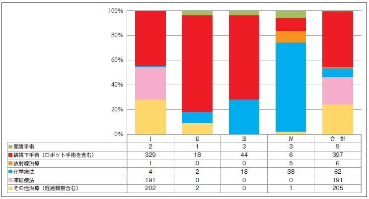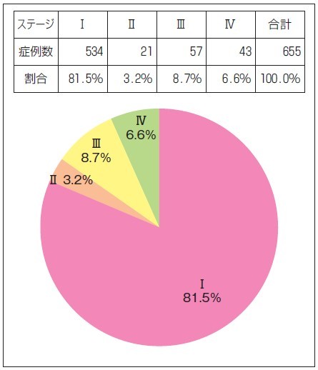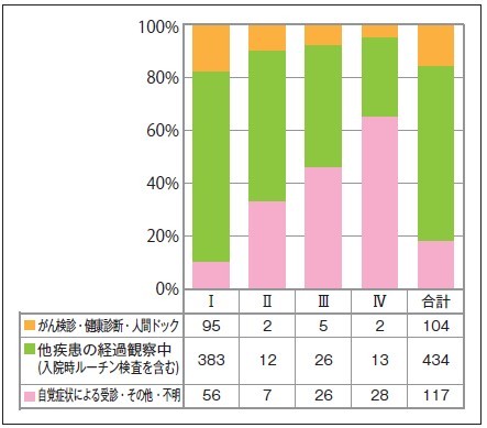 当院に初診された方の約4/5(85%)が転移のない状態で治療を受けておられ(ステージ別症例数)、近年では他の疾患の検査、健診や人間ドッグで早期に発見されるがんが増えています(ステージ別発見経緯)。