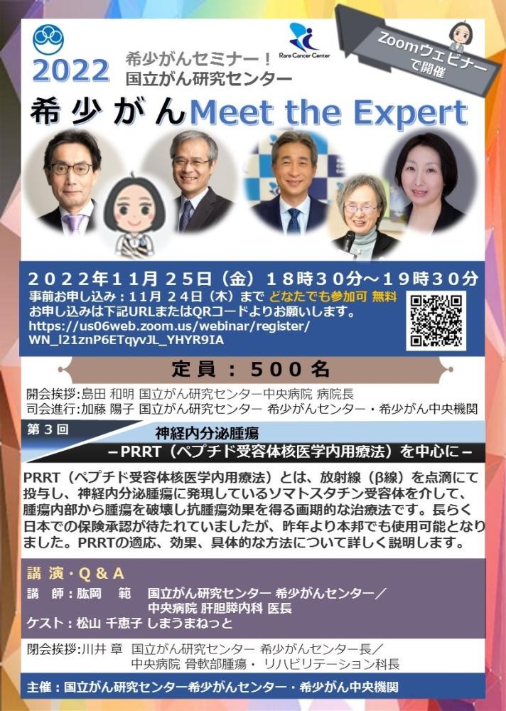 第3回「希少がん Meet the Expert」 神経内分泌腫瘍-PRRT(ペプチド受容体核医学内用療法)を中心に- ※動画一部公開 お知らせ