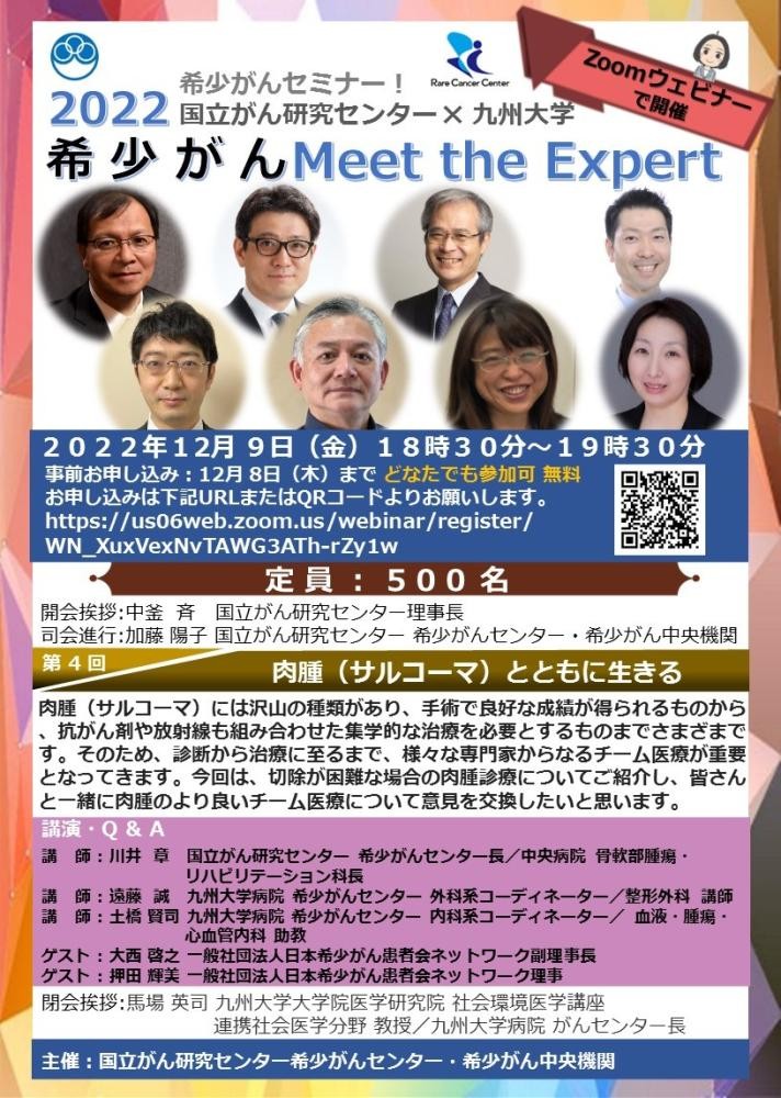 2022年12月9日(金)にオンラインにて開催されました希少がんセミナーに九州大学病院の先生方が講義を行われました。